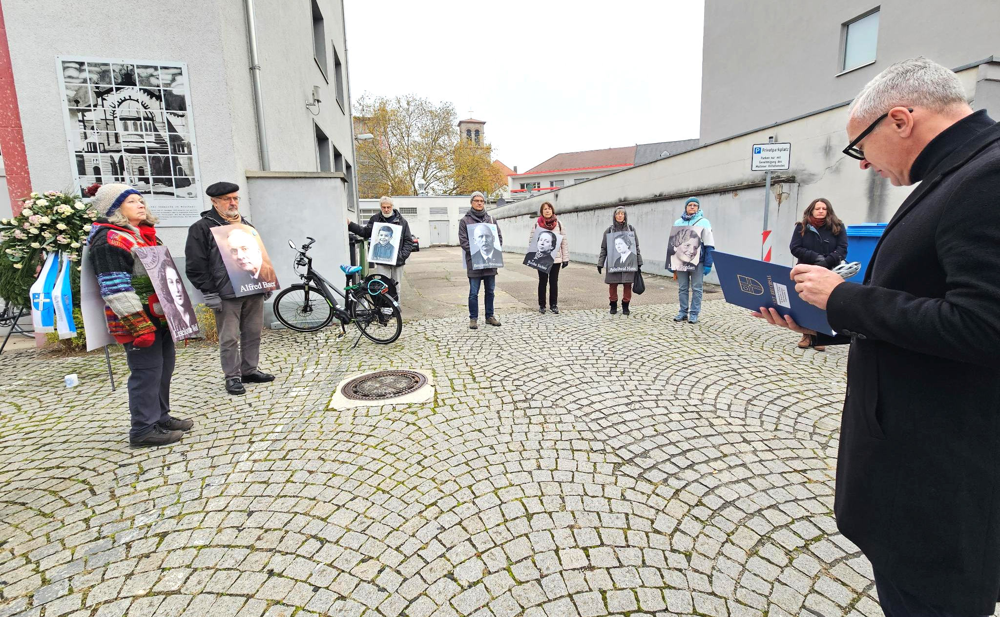 Im Anschluss trafen sich alle Mitwirkenden und weitere Personen am Platz der ehemaligen Synagoge. Dr. Rüdiger Czolk begrüßte die Anwesenden im Namen der Friedensinitiative. Er erklärte, dass dieses jährliche Gedenken an die Pogromnacht eine leider immer noch notwendige Tradition ist, die die Friedensinitiative seit den 1990er