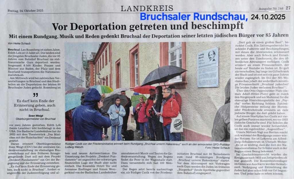 Die Friedeninitiative beteiligte sich an den zahlreichen städtischen Veranstaltungen anlässlich des 85. Jahrestages der Deportation der jüdischen Mitbürgerinnen und Mitbürger nach Gurs mit ihrem Rundgang „Bruchsal unterm Hakenkreuz“. Der Weg führt über den Otto-Oppenheimer Platz (damals Adolf-Hitler-Platz) durch den Bürgerpark und am Mahnmal für die ehemalige Hinrichtungsstätte der „Psycha“ vorbei Richtung Schloss. Zahlreiche Stolpersteine entlang der Hutten- oder Friedrichstraße erinnern an jüdische Bürger und Bürgerinnen, die dort lebten. Mit gelben Punkten auf einem Stadtplan zeigte Czolk, wo vor 1933 jüdische Geschäfte waren. Der Rundgang führt immer schmerzhaft die Geschichte vor Augen und wird regelmäßig von der Friedensinitiative angeboten.